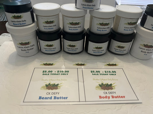 🌈 A Scent for Every Mood:💼 Business Meeting? Try our "CK Defy or Dior-scent for a sophisticated aura.🏞️ Weekend Adventure? Embrace the rugged outdoors with "Bronze Wood or Crimson Musk."🌹 Date Night? Ignite the romance with "Zanzibar or Coco Mango" Shealux Beard Butters & Body Butters Combo Sets: Small: $12.50 & Medium $23.00