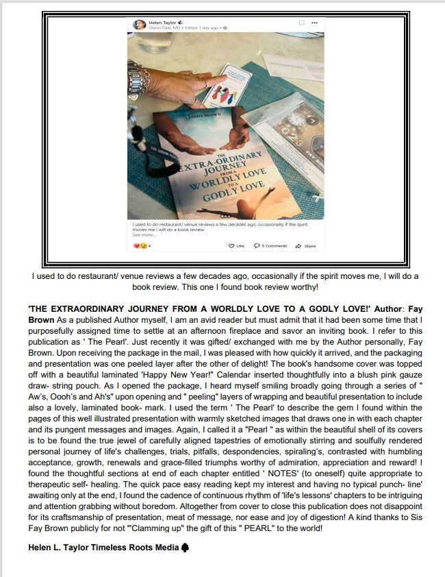 Linda Fay Brown - the talented author behind "The Extraordinary Journey from A Worldly Love to Godly Love," is not just a wordsmith but a dynamic entrepreneur and founder. As the owner of Shealine Whipped Body Butter and the visionary behind her Non-profit organization Women Lifting Up Women For His Glory, Inc., Linda brings a unique blend of creativity and empowerment to her work. In her book, she fearlessly explores the intricacies of relationships, delving into the good, the bad, and the ugly, while incorporating the insights of other contributors. With a heartfelt narrative, Linda unveils the true essence of love, offering readers an uplifting journey through the complexities of relationships.
